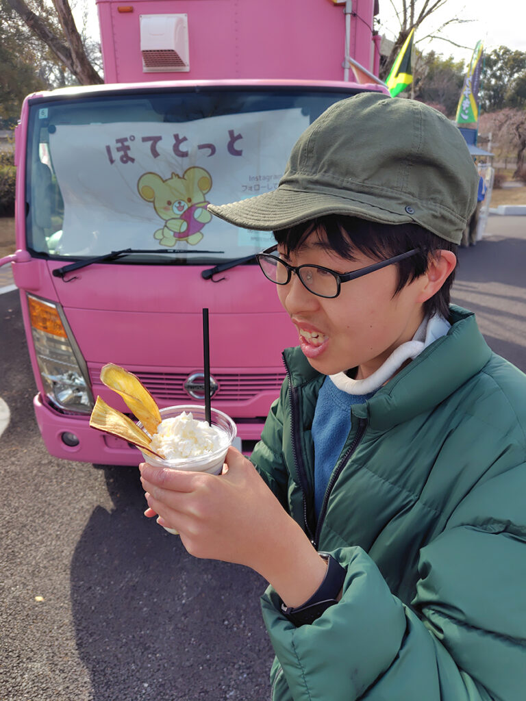 朝一番に足を運んで、3組の大道芸を堪能していました。キッチンカーのスイーツもちゃっかりゲットして、前の方の席を陣取って楽しんでいました。
